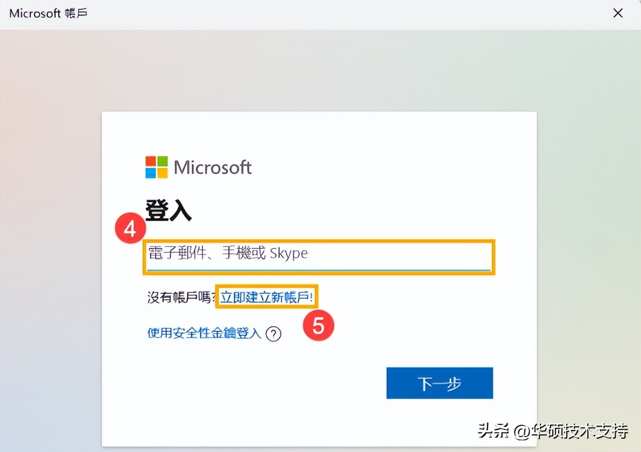 3, 請登入您用于其他Microsoft服務(如Outlook、Office等)的電子郵件、電話號碼或Skype帳戶④。如果您沒有Microsoft賬戶,請點選[立即建立新賬戶!]