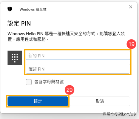 11,設定您要使用的PIN碼?,然后點選[確定]?。此PIN碼將會用于您之后登入Windows使用。