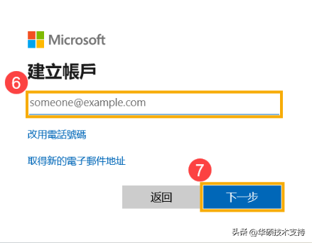 4, 請輸入您的電子郵件信箱⑥(這個信箱將作為您的Microsoft賬戶登入賬號),然后點選[下一步]⑦。