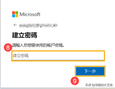5,請輸入您想要使用的Microsoft帳戶密碼⑧,然后點擊[下一步]⑨。