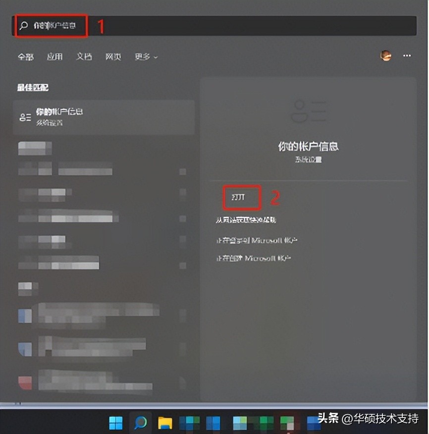 1,在Windows搜尋欄輸入[你的]①,然后點選你的賬戶信息,選擇[打開]②。