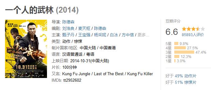 晚幾個月上映的《一個人的武林》也受到了影響,很多網友甚至在影片未上映時就紛紛打出一星差評,讓《一個人的武林》丟失了先機。